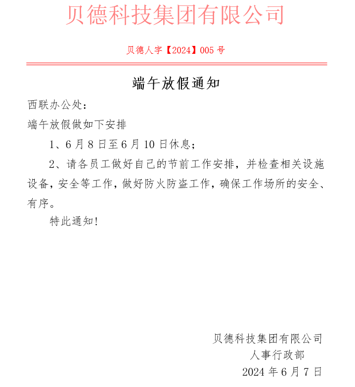 2024年端午節貝德科技集團放假通知